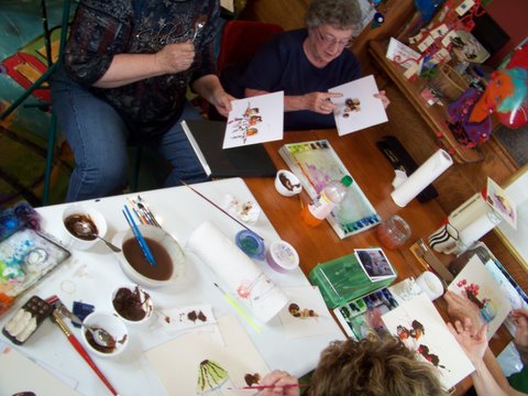 What fun we had today! Painting with the well handled, maybe licked, chocolates from Stam. Jo melted the chocolates in microwave till soft and we painted with them, licking our fingers. The chocolate is so smooth and rich! We added a bit of watercolor for shadows or a center. Oh what fun and beautiful too..