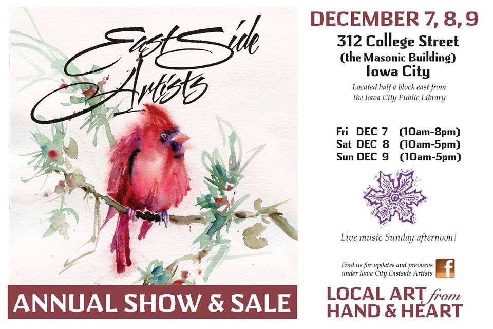 (Above left) The postcard for this year’s Eastside Artists Annual Show & Sale features my cardinal painting. I sent them three to choose from, and they picked this slightly frumpy young bird with his feathers a little ruffled.