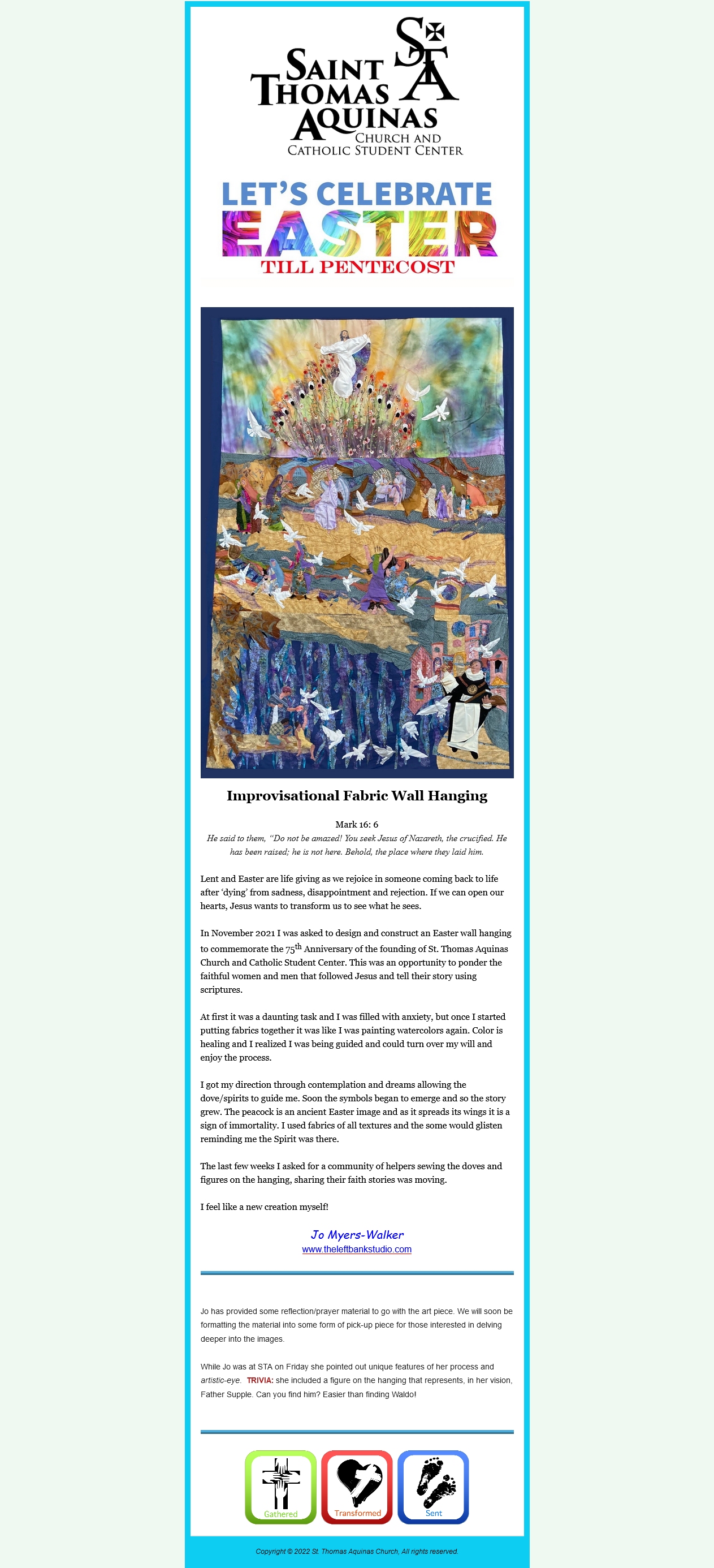 I was pleased to have the opportunity to meet with family members on Easter weekend and see my “Improvisational Fabric Wall Hanging” on display in the space it was designed for. The work commemorates the 75th anniversary of the founding of St. Thomas Aquinas Church and Catholic Student Center in Ames. Its size (8′ x 12′) reflects the scale of the church wall, and allows room to tell the Easter story in a series of scenes created from fabric shapes.