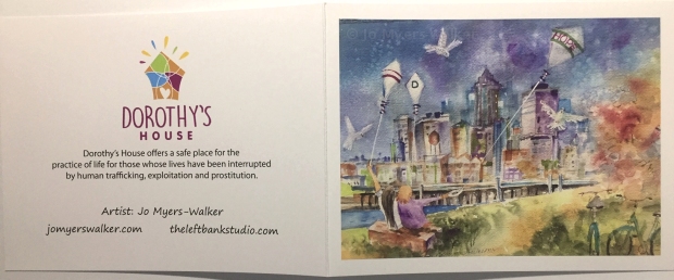 The cards are available as a set of four, with envelopes, and I’ve been bringing them with me to events. Send me an email (jomyerswalker@gmail.com) if you’re interested, and see my Creating for a Cause page for more “products with a purpose”!